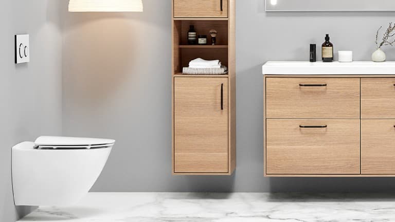 En annan möjlighet är att installera en designprodukt som Geberit Monolith - en modul som innehåller allt som krävs för att kunna installera en vägghängd toalett och som dessutom har andra användbara funktioner. Snyggt och smidigt.